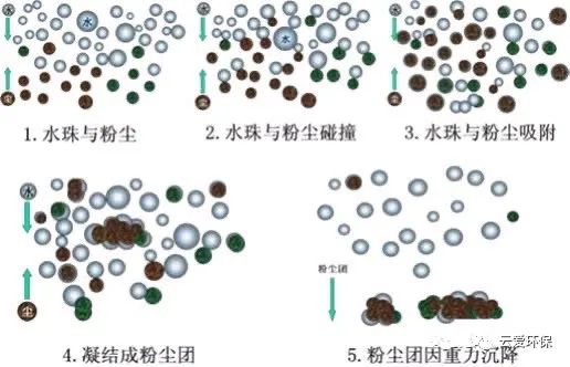 美國(guó)《煤炭時(shí)代雜志》發(fā)表的題為“科羅拉多礦業(yè)學(xué)院解決可吸入塵埃的控制”一文中提到:水霧顆粒與塵埃顆粒大小相近時(shí)吸附、過(guò)濾、凝結(jié)的機(jī)率大為原理, 水霧顆粒與塵埃顆粒大小相近時(shí),塵埃顆粒隨氣流運(yùn)動(dòng)時(shí)與水霧顆粒發(fā)生碰撞、吸附、凝結(jié),形成的塵埃團(tuán)在重力作用下降落,從而達(dá)到過(guò)濾塵埃的目的。