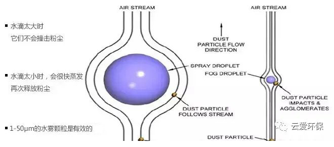根據(jù)粉塵聚合理論和空氣動(dòng)力學(xué)理論,粉塵顆粒一般直徑在0.1um-75um,當(dāng)粉塵顆粒與比它體積大得多的水滴相遇時(shí),會(huì)被水滴旁邊的空氣流(流速快)帶動(dòng)前進(jìn)而不與水滴相碰。而與粉塵顆粒大小相接近的霧滴,表面張力小,易于和粉塵結(jié)合,使微霧顆粒與粉塵顆粒相互碰撞、粘結(jié)、聚合增大,并在自身重力作用下沉降,達(dá)到抑塵目的。