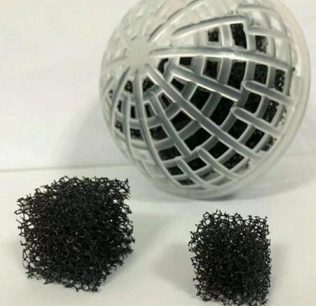 本填料規(guī)格:PP外支撐骨架,直徑:φ100mm;內(nèi)置特殊聚氨酯載體填料,規(guī)格:30×30×20mm、20×20×20mm,內(nèi)孔直徑:2~2.5mm,開(kāi)孔率>90%,表面積:>5000m²/m³;每立方池子堆放:50%~70%。