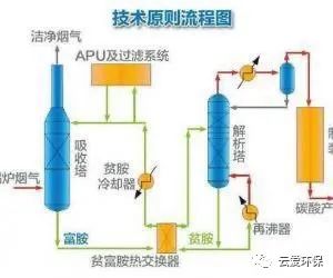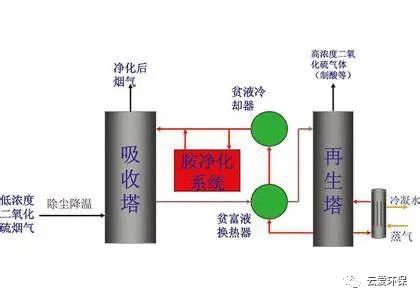 脫硫原理:該工藝利用有機胺溶劑的堿性吸收煙氣中的酸性氣體SO2,并利用解吸裝置使SO2從胺液中脫離出來,得到高純度的飽和SO2,有機胺再生并循環(huán)使用,SO2可用來制硫酸或硫磺。