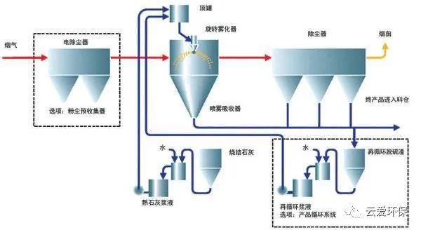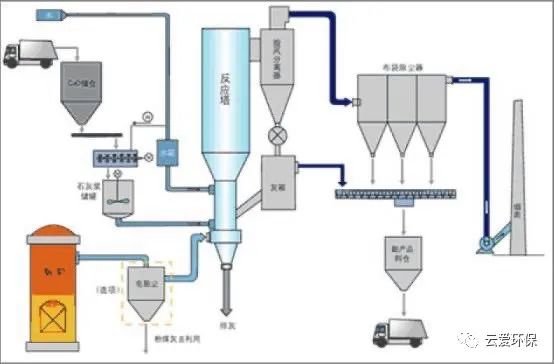 脫硫原理:該系統(tǒng)有石灰漿制備、噴霧干燥塔和布袋除塵器(或靜電除塵器)三部分組成。該系統(tǒng)通過高速旋轉(zhuǎn)噴霧頭將石灰漿噴入噴霧干燥塔,與煙氣中酸性物充分接觸并起中和反應(yīng),利用煙氣中的余熱使石灰漿液中的水分蒸發(fā),脫硫后的煙氣經(jīng)除塵器除塵后排放。