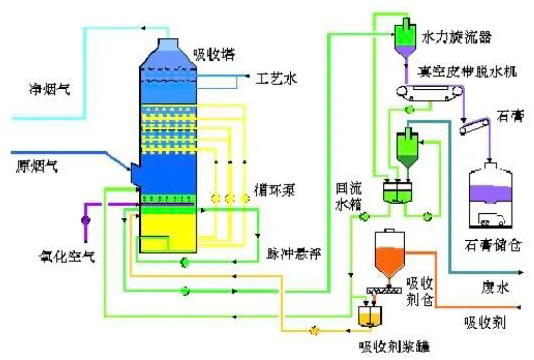 工藝流程:石灰石與水混合攪拌制成吸收漿液,在吸收塔內(nèi),吸收漿液與煙氣按觸混合,煙氣中的二氧化硫與漿液中的碳酸鈣以及鼓入的氧化空氣進行化學反應(yīng)吸收脫除二氧化硫,產(chǎn)物為石膏。脫硫后的煙氣經(jīng)過除霧器除去霧滴,從煙囪排放。