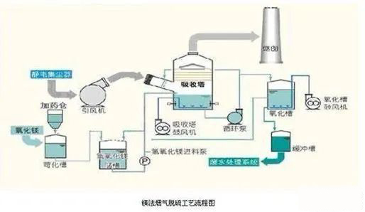 脫硫原理:采用菱鎂礦經(jīng)過煅燒生成的氧化鎂,氧化鈣作為脫硫吸收劑,將氧化鎂和氧化鈣通過漿液制備系統(tǒng)制成氫氧化鎂,氫氧化鈣在脫硫吸收塔內(nèi)與煙氣充分接觸,煙氣中的二氧化硫與漿液中的氫氧化鎂,氫氧化鈣進行化學反應(yīng)生成亞硫酸鎂,亞硫酸鈣,脫除燃煤煙氣中的SO2、SO3、HCl、HF等酸性物質(zhì),凈化燃煤煙氣。